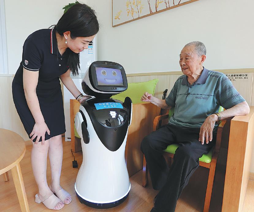 A social worker (left) guides a senior citizen on how to interact with an artificial intelligence-powered robot at a community center in Zhengzhou, Henan province. (Photo/China Daily)