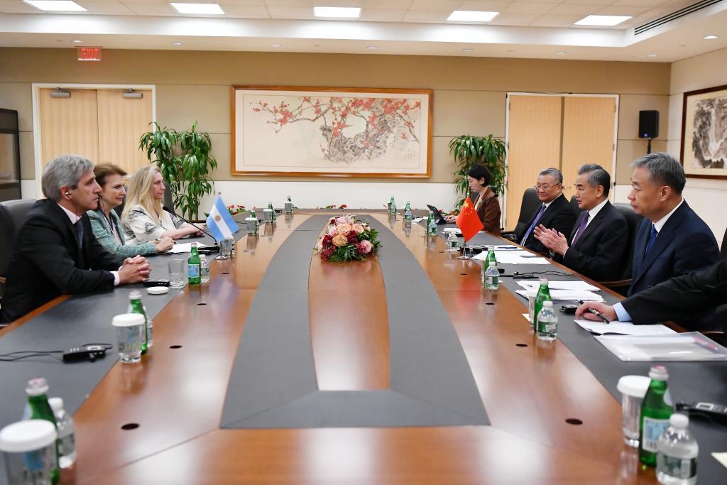 Chinese Foreign Minister Wang Yi, also a member of the Political Bureau of the Communist Party of China Central Committee, meets with Argentine Foreign Minister Diana Mondino on the sidelines of the UN General Assembly in New York, Sept. 24, 2024. (Photo/Xinhua)