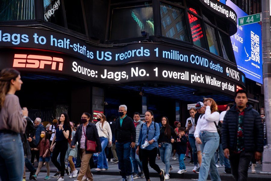 Pedestrians walk in front of a Times Square news ticker in New York, the United States, on May 12, 2022. (Photo/Xinhua)
