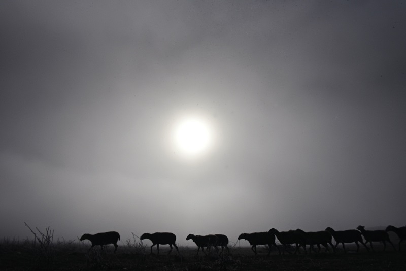 A flock of sheep seen walking single file in the early morning near a small village named Viana de Duero north of Spain, where temperatures dropped to minus eight degrees Celsius on Jan. 11, 2020.