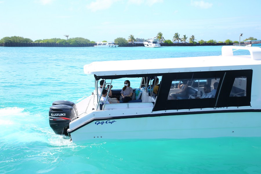 Chinese tourists leave for the resort island by boat from the Velana International Airport on Jan. 18, 2023. (Photo/Xinhua)