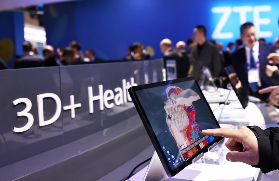 A visitor tries the new version of the Nubia 3D pad, a 5G+AI eyewear-free 3D Pad displayed at Chinese telecom company ZTE’s booth during the Mobile World Congress (MWC) 2024 in Barcelona, Spain, Feb. 28, 2024. (Photo/Xinhua)