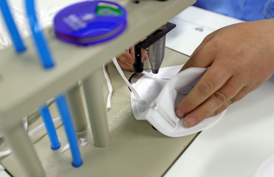 A worker produces a medical mask at Liaoning Shengjingtang Biotechnology Co., Ltd in Shenyang, capital of northeast China’s Liaoning Province, April 14, 2020. (Photo/Xinhua)