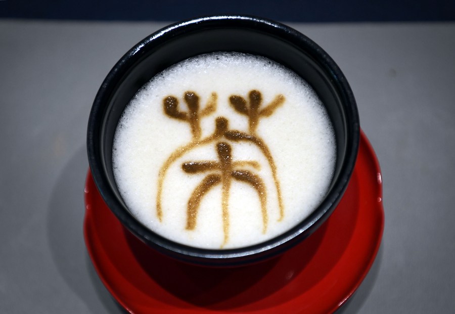 The Chinese character “cha”, which means tea, is seen atop a cup of tea in Zhengzhou, central China’s Henan Province, Jun. 22, 2022. (Photo/Xinhua)