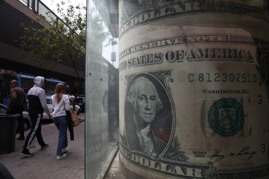 People walk past a foreign exchange office in Cairo, Egypt, on Mar. 21, 2022. (Photo/Xinhua)