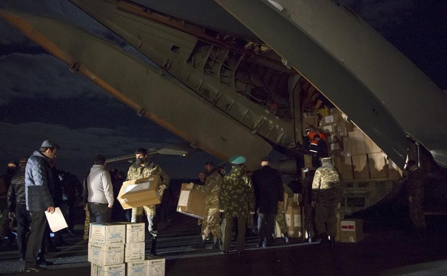 Workers transfer medical supplies from China at the Zvartnots International Airport in Yerevan, Armenia, April 8, 2020.(Armenian Ministry of Foreign Affairs/Handout via Xinhua)