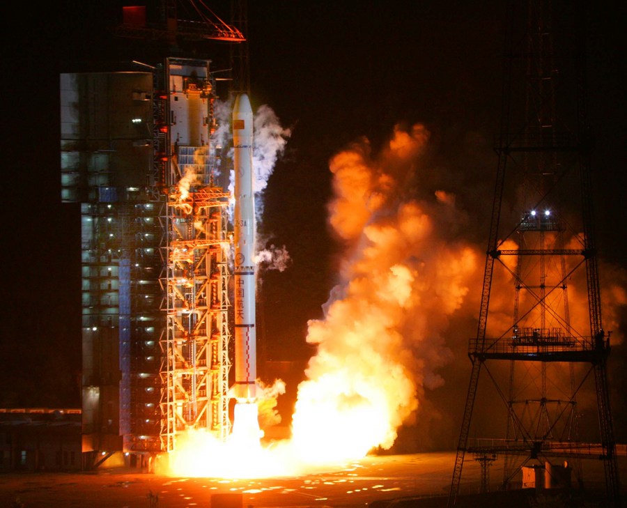 A carrier rocket carrying a satellite of the BeiDou Navigation Satellite System (BDS) blasts off from the Xichang Satellite Launch Center in southwest China’s Sichuan Province, Apr. 14, 2007. (Photo/Xinhua)