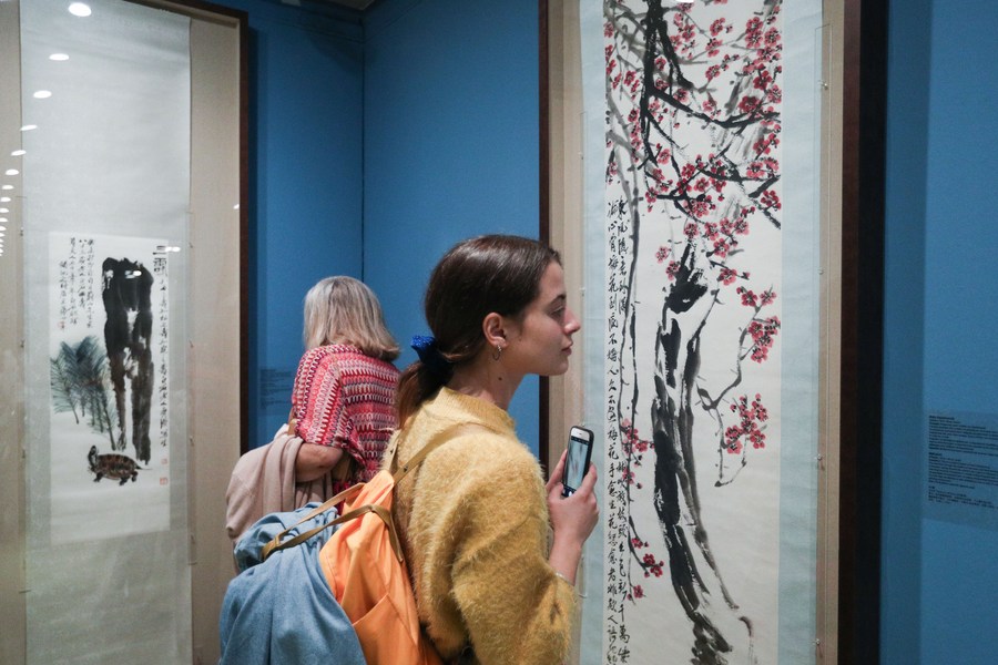 Visitors view exhibits during an art exhibition of creations by Chinese artist Qi Baishi at the B&M Theocharakis in Athens, Greece, Nov. 12, 2019. (Photo/Xinhua)
