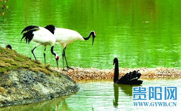 Red-crowned cranes and black swans in the lake of a wetland park in the Guiyang city center.