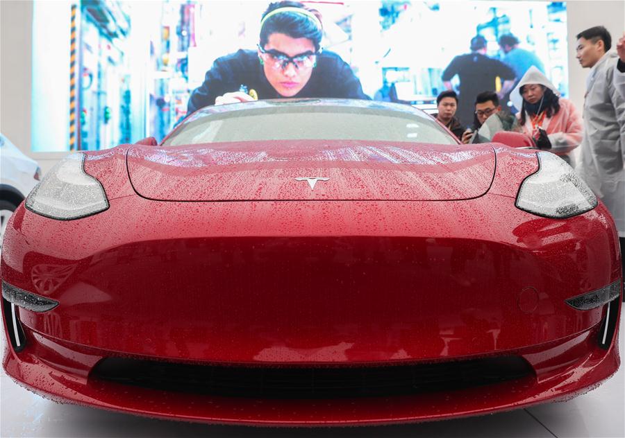 A Tesla Model 3 is displayed at the groundbreaking ceremony of Tesla Shanghai Gigafactory in Shanghai, east China, Jan. 7, 2019. (Photo/Xinhua)