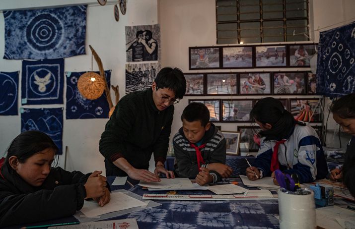 Students create their dyeing patterns in class in Dulongjiang Township, Yunnan Province, on April 25 (COURTESY PHOTO)