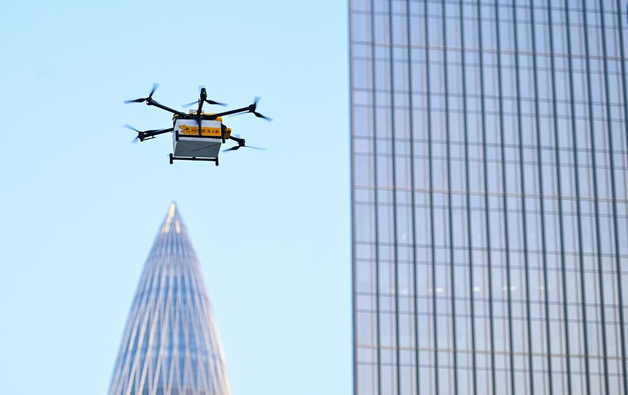 An unmanned food delivery drone is pictured in Shenzhen, south China’s Guangdong Province, Nov. 24, 2023. (Xinhua/Mao Siqian)