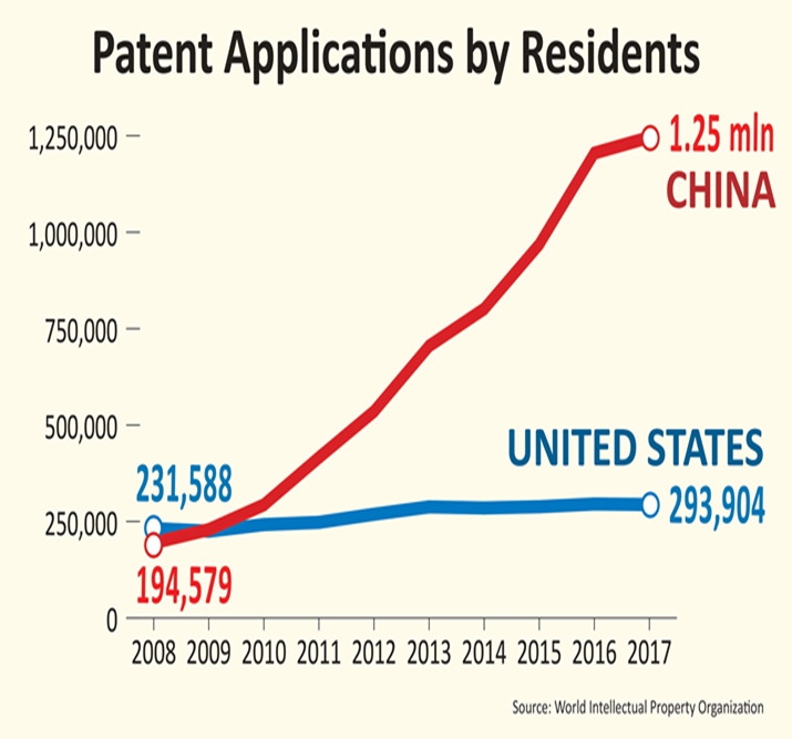 In 2008, the resident patent applications from China were about 200,000, and from the U.S. about 230,000, comfortably ahead of China. But in 2017, the figure from China rose to over 1 million, while the U.S. number hadn’t changed much, remaining at under 300,000.