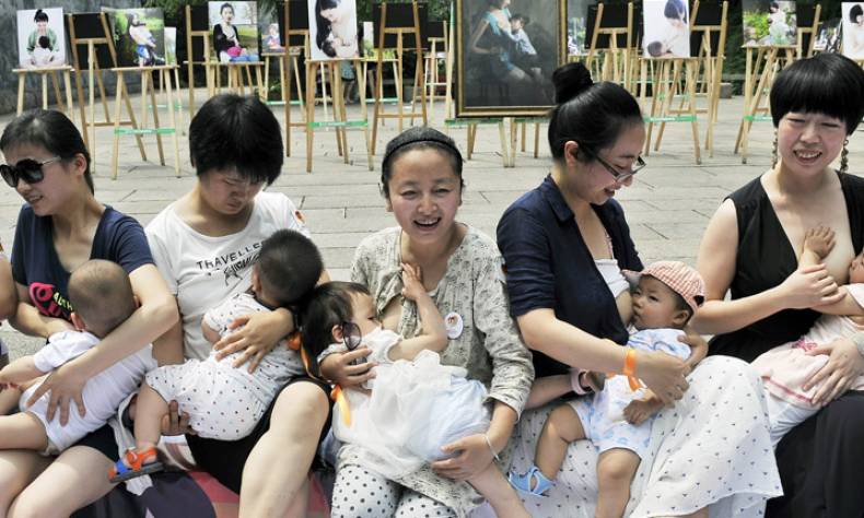 Chinese society has long regarded public exposure of one’s body with conservatism and taboos. However, more and more people are beginning to demonstrate their open-mindedness on the issue, proclaiming it as a natural human behavior. In June 2014, a flash mob involving 20 young mothers showed up at a park in Zhejiang’s Leqing City. The women walked to a grassy area from different sides, each holding a baby and wearing a yellow ribbon around their wrist, and then all sat down as one to breastfeed their babies, their husbands behind them for support and to take photos to publicize the issue.