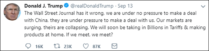▲ Trump tweeted: “We are under no pressure to make a deal with China, they are under pressure to make a deal with us.”