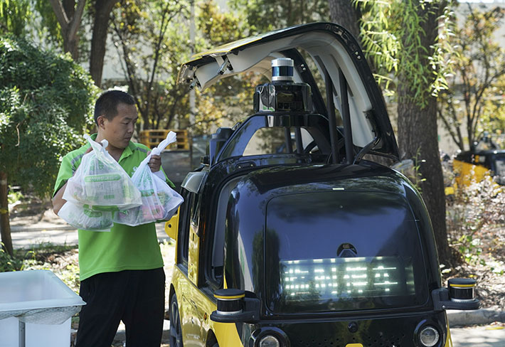 A staff member places customer orders into an automated delivery vehicle at a warehouse of an instant retail platform located in Shunyi District, Beijing, on Aug. 22, 2023. (Photo/Xinhua)