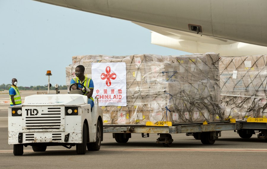 A staff member unloads Chinese medical supplies from an airplane at the Kotota International Airport in Accra, Ghana, April 6, 2020. (Photo/Xinhua)