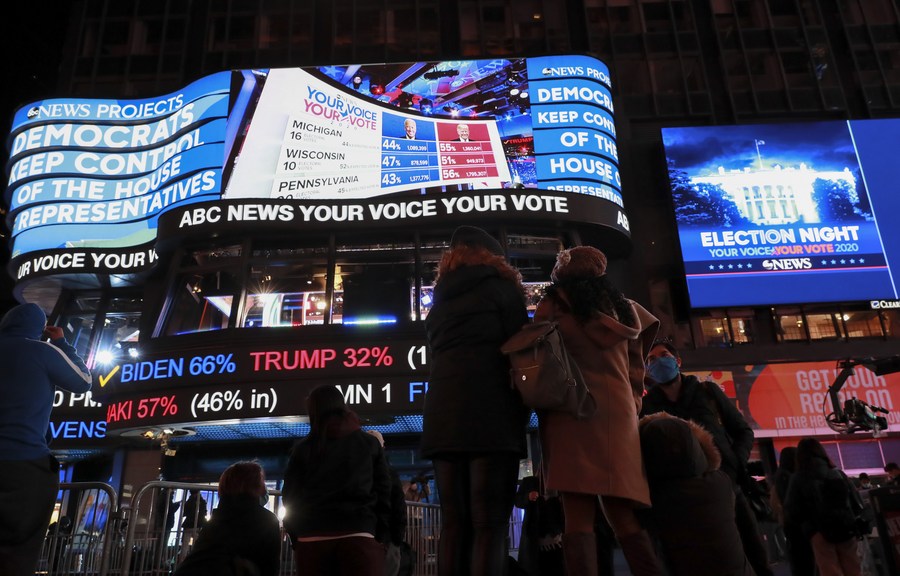 People watch live broadcast of the ballot counting during the 2020 U.S. presidential election on Times Square in New York, the United States, Nov. 3, 2020. (Photo/Xinhua)